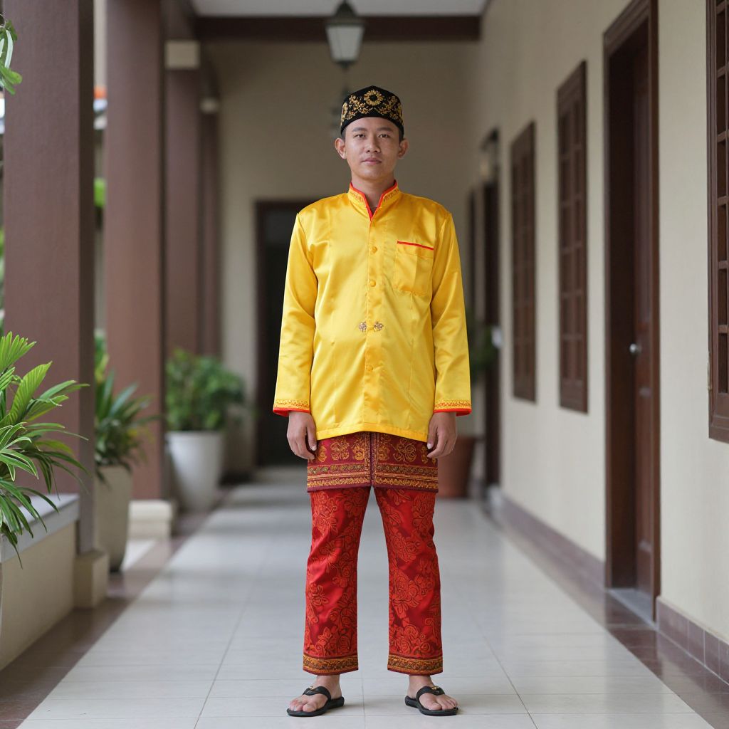 Photograph of a young man in traditional yellow Baju Melayu and red batik pants, wearing a black patterned headscarf, standing