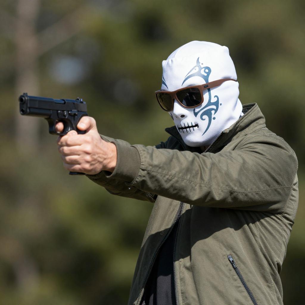 Middle-aged man in beige hat and light blue shirt, gray jacket, holding silver handgun, aiming at burning car with tires. Car's front end heavily damaged, fire blazing from engine. Smoky background, daytime. Man's expression focused, intense. Burned car dominates background.