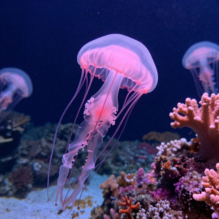 Photograph of a vibrant underwater scene featuring a single, glowing pink and white jellyfish with translucent, flowing tentacles in the center. The background is a dark blue ocean, with two more jellyfish slightly blurred in the distance. On the right, colorful coral reefs with pink, orange, and purple hues add texture and contrast. The jellyfish's ethereal light contrasts with the dark background, highlighting its delicate, flowing forms. The coral reefs have a rough, bumpy texture, while the jellyfish appear soft and translucent.