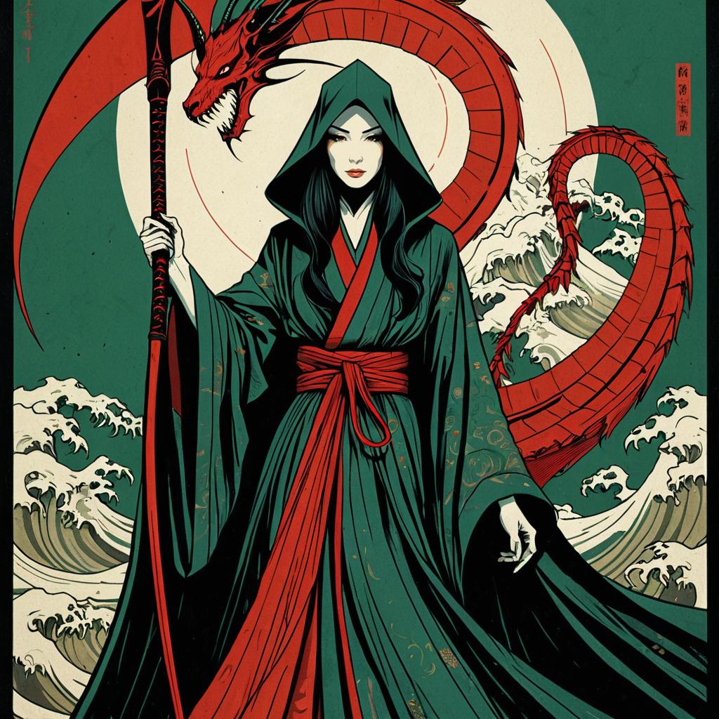 Screen print portrait of a enigmatic phoenix in a long flowing robe holding a huge red scythe, in the style of Christopher Balaskas, dynamic pose, shaded, black, red, and green colors only, matte print, editorial illustration