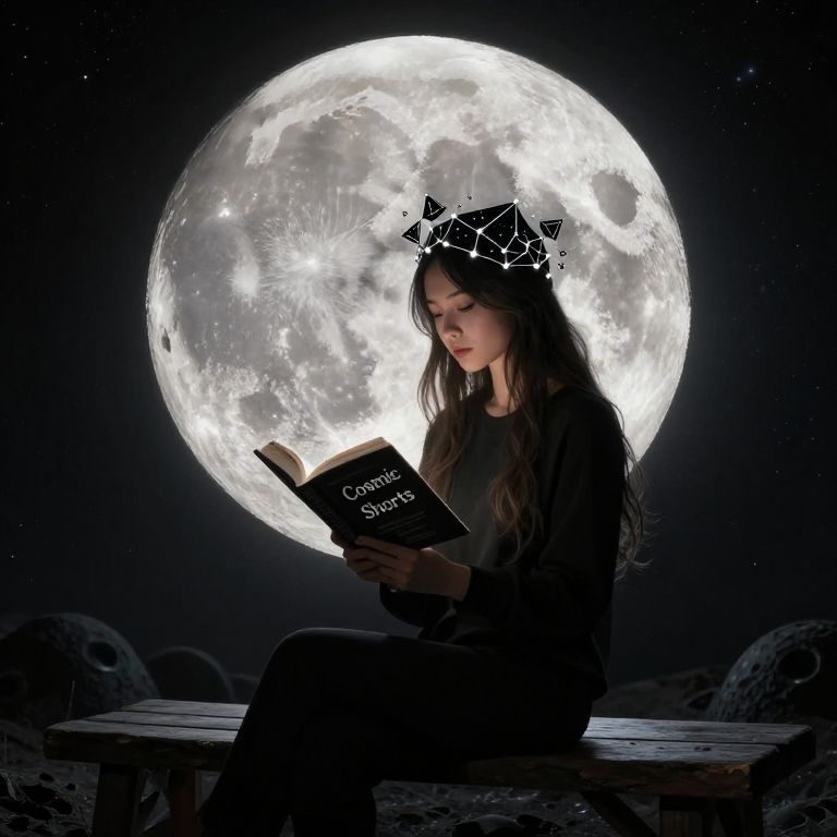 The moon is wearing a crown of geometric constellations and sits on a bench of black holes, reading a book titled 'Cosmic Shorts.'