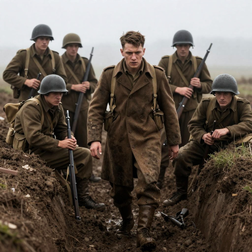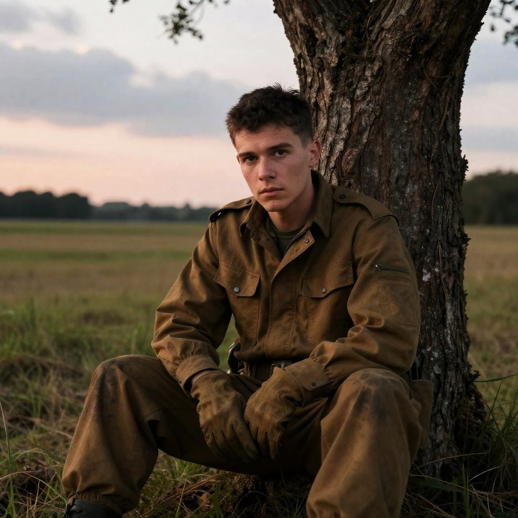 Photograph of two male soldiers in brown uniforms leaning against a tree. One soldier lies on the ground with a concerned expression, the other stands behind him. Field with yellow flowers in the background. Soldier's faces show worry and concern. Tree trunk on the right. Soldier standing holds a gun in his belt.