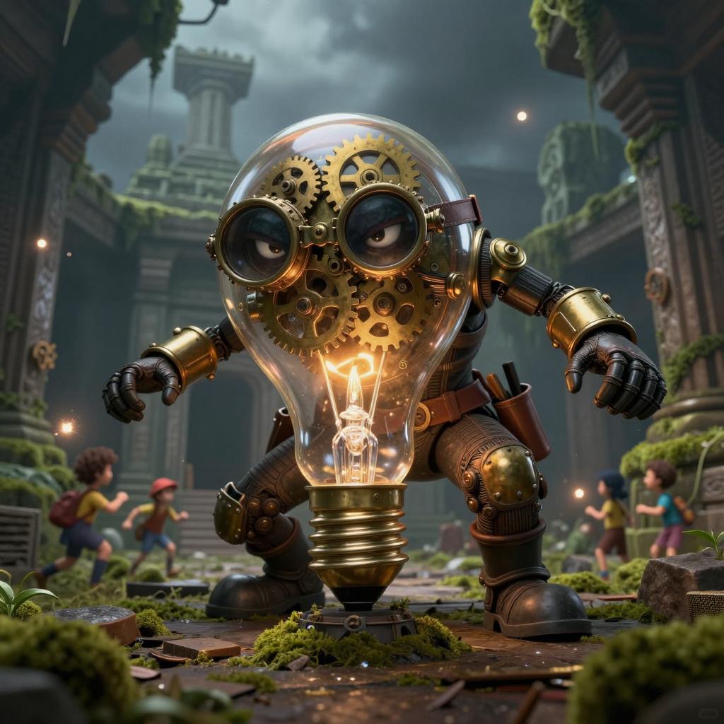 Anthropomorphic lightbulb inventor character with clockwork gears and brass panels body, steampunk goggles and tool belt, focused competitive glare expression, crouched low, ready to spring in ancient temple courtyard overgrown with moss, under stormy overhead light with distant flashes, children’s book illustration feel, highly detailed, dynamic composition, 8k render