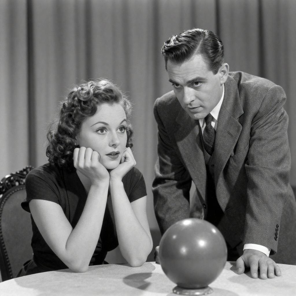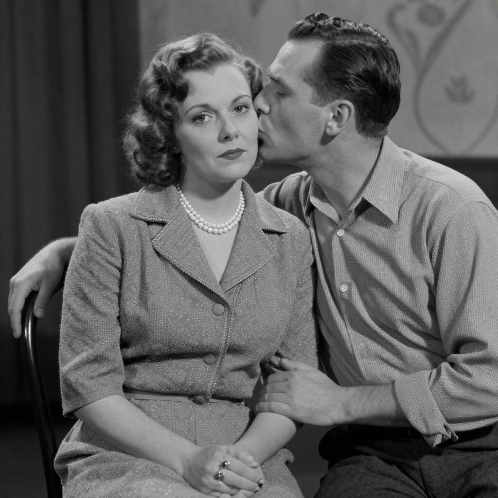 Black and white photograph of a young couple in 1930s-style clothing. Woman with blonde hair, plaid jacket, and dark dress stands behind man, who leans on table, wearing suit and tie. She rests hand on his head. Man's expression is contemplative. Background includes wooden furniture and blurred interior. Table has two books. Woman's expression is concerned.