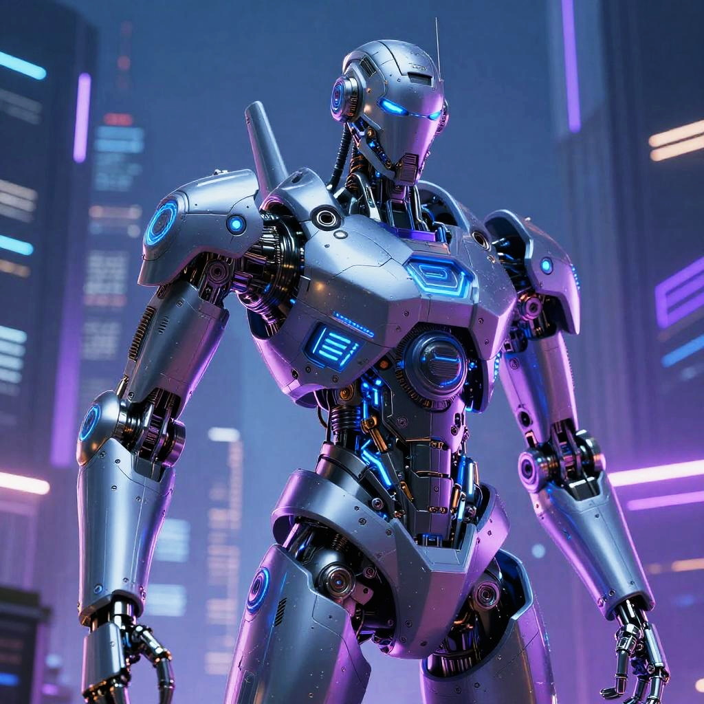 Futuristic machines in a neon-lit cyberpunk cityscape, sleek metal surfaces, glowing blue and purple lights, intricate mechanical details, high-tech urban environment, digital art