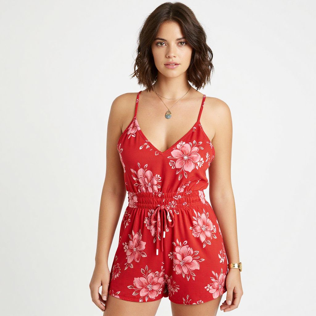 "Woman, casual bohemian, crimson red romper with pink floral pattern, v-neck, thin spaghetti straps, cinched waist with drawstring, relaxed shorts, side pockets, visible pendant necklace, wristwatch, wavy bob hairstyle, plain white background.. Sexy. Pretty face and beаutiful eyes. Big breasts."