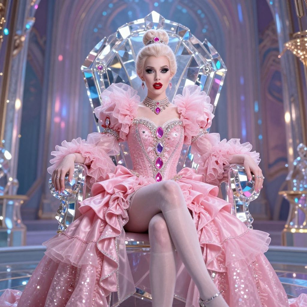 Yassified image of Trump in an extravagant ball gown, heavy glitter makeup with bold lips, famous hair exaggerated with volume and shine, colorful sparkling background, high fantasy glamor photography style, rich textures and contrasts.