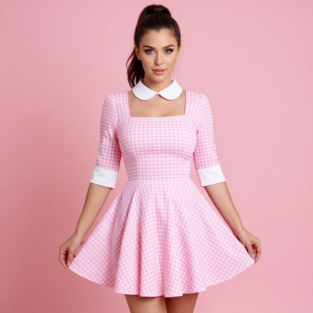 "Woman, retro-inspired, pink gingham A-line mini dress, white Peter Pan collar, three-quarter sleeves with white cuffs, fitted bodice, flared skirt, simple make-up, high ponytail, pink studio background.. Sexy. Pretty face and beаutiful eyes. Big breasts."