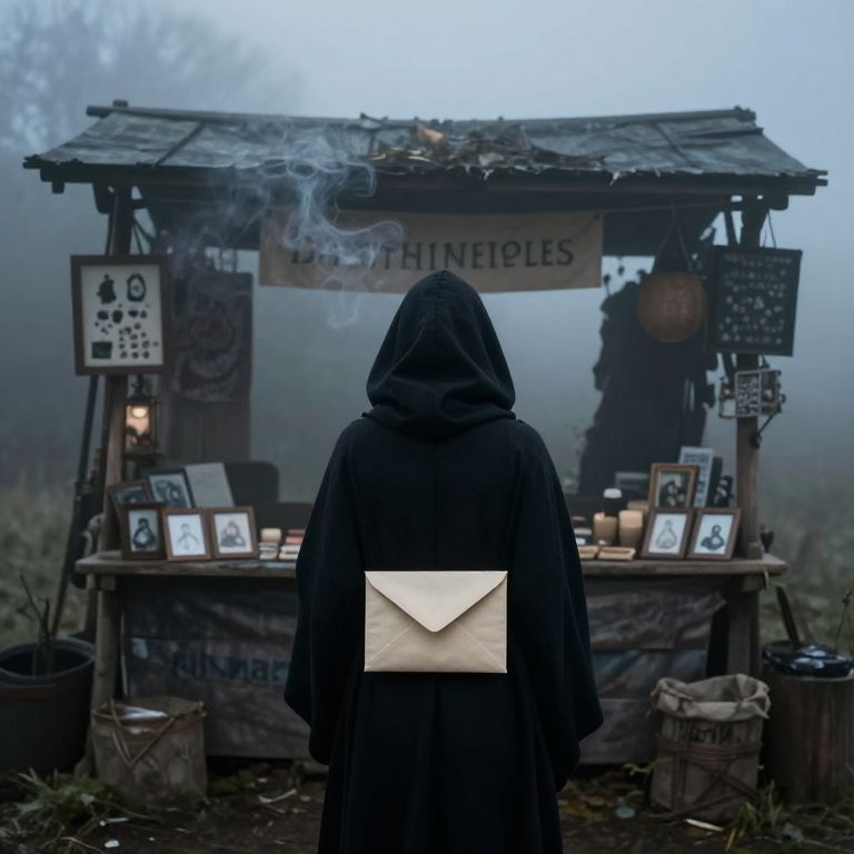 Photograph of a hooded figure in black cloak, back facing, standing before a misty, smoke-filled "Divine Epiphany" stall