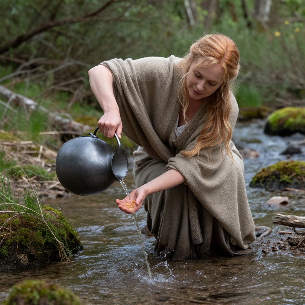 Serenity whispers through the gentle stream as a woman, cloaked in earthy tones, pours life into the land, embodying the timeless dance between humanity and nature.