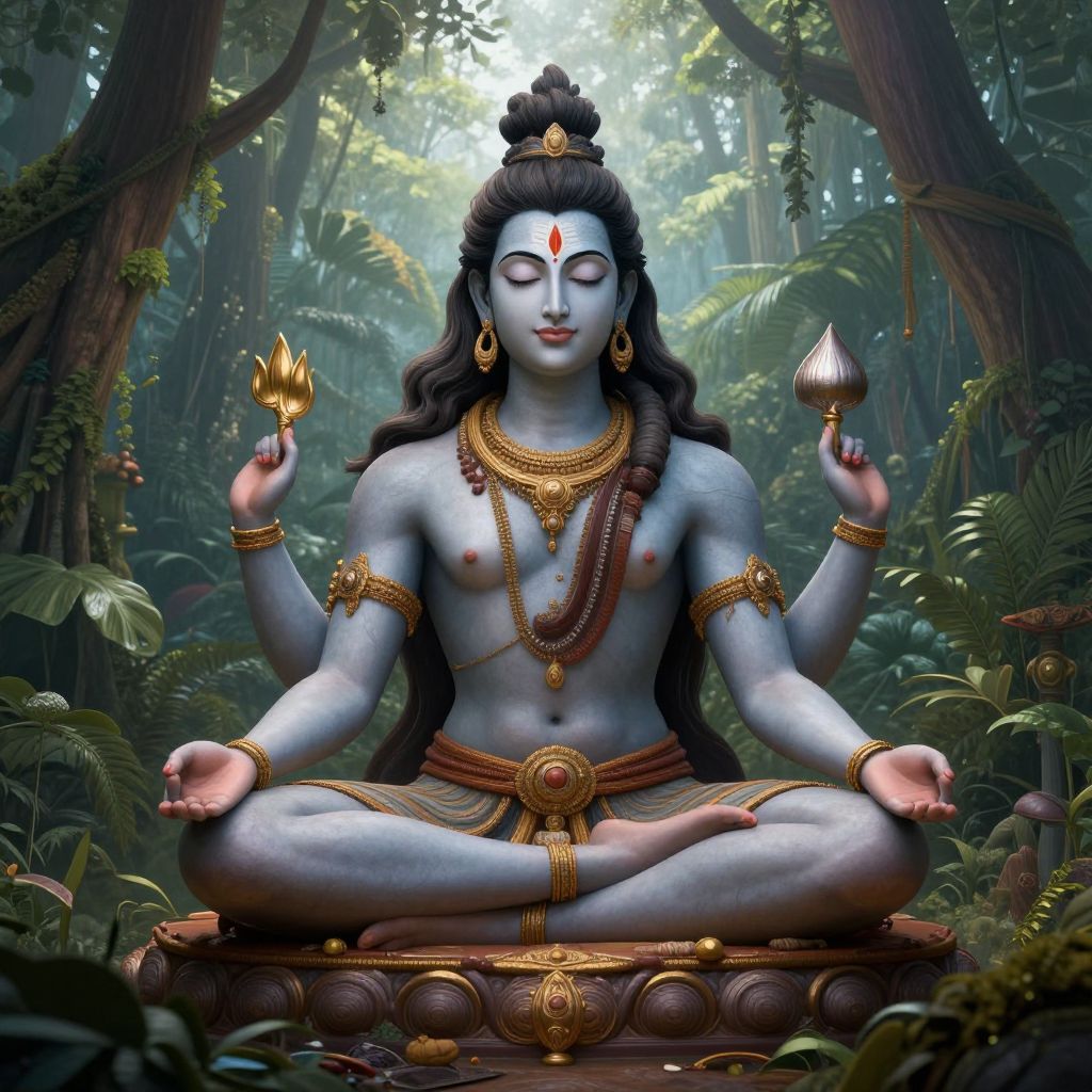 Digital art of blue-skinned Shiva statue in forest, sitting cross-legged, holding trident and lotus, adorned with gold jewelry and red gem
