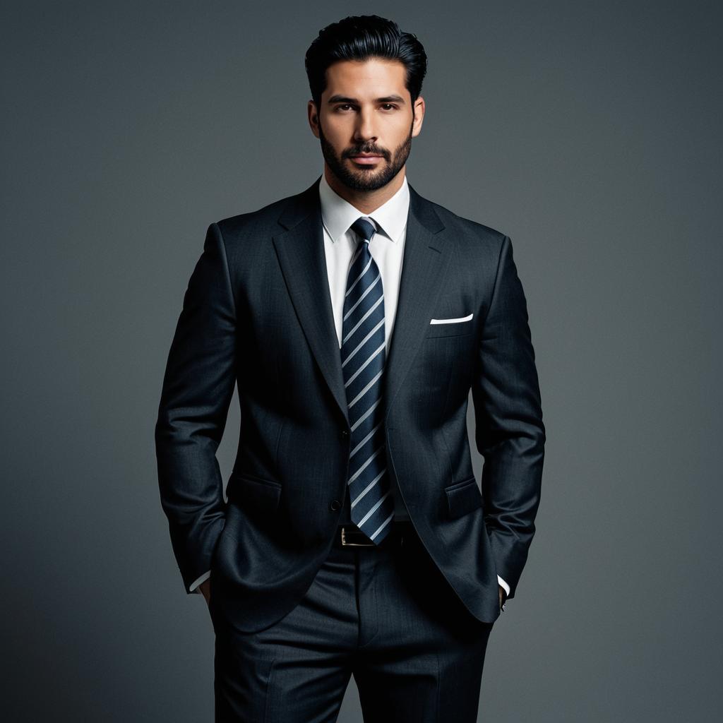 Inner suit man,1boy, solo, male focus, necktie, suit, formal, realistic, hands in pockets, facial hair, manly, black hair, jacket, real life insert, pants