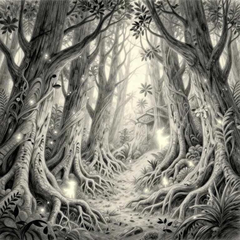 Rawing of an ancient mythical forest, detailed hand-drawn style, lush trees with twisting roots, mystical glowing creatures hidden among foliage, soft pencil shading and intricate linework, fantasy setting, atmospheric and enchanting mood