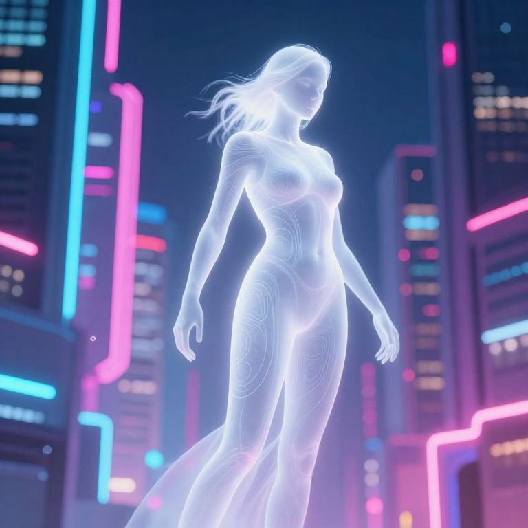 White entity drifting through a neon-lit futuristic cityscape, semi-transparent with subtle glowing patterns, blending ethereal and cyberpunk aesthetics, vivid colors