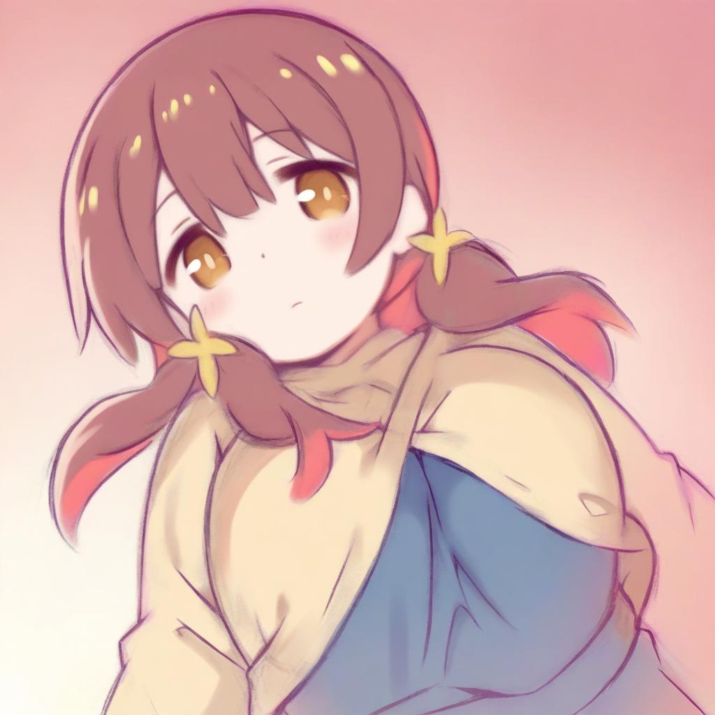 This is a digital anime-style drawing of a young woman with large, expressive brown eyes and brown hair adorned with yellow star-shaped hairpins. Her hair is styled in two low pigtails with pink highlights. She wears a blue top with a cream-colored, off-the-shoulder jacket draped over it. The background is a soft gradient of pink to white, giving a gentle, warm atmosphere. The character's expression is neutral, and her overall appearance is cute and innocent. The art style is characterized by soft, pastel colors and gentle shading, emphasizing a gentle and warm aesthetic.