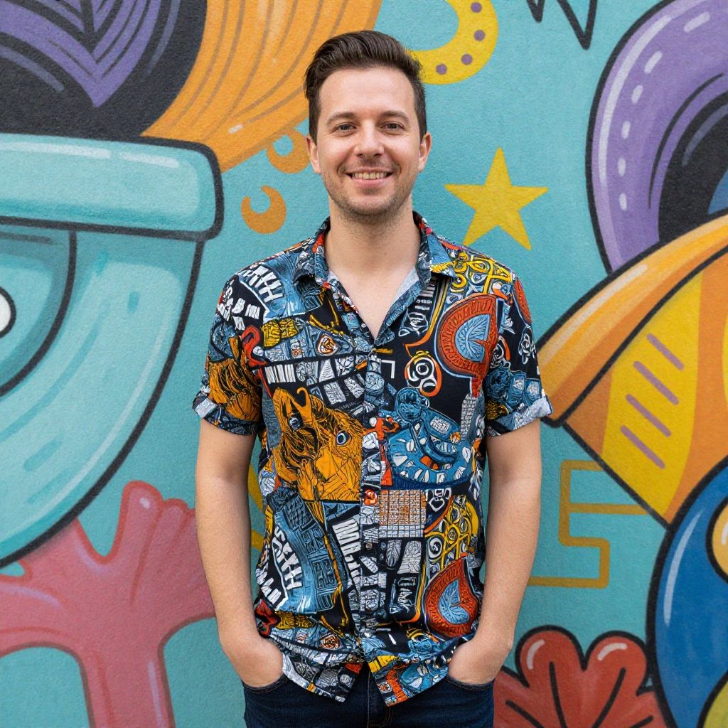 An artistic portrait of a smiling man wearing a colorful printed shirt stands confidently in front of a vibrant mural with assorted designs. The man's casual and relaxed demeanor complements the lively and playful background, creating a lively and engaging scene.