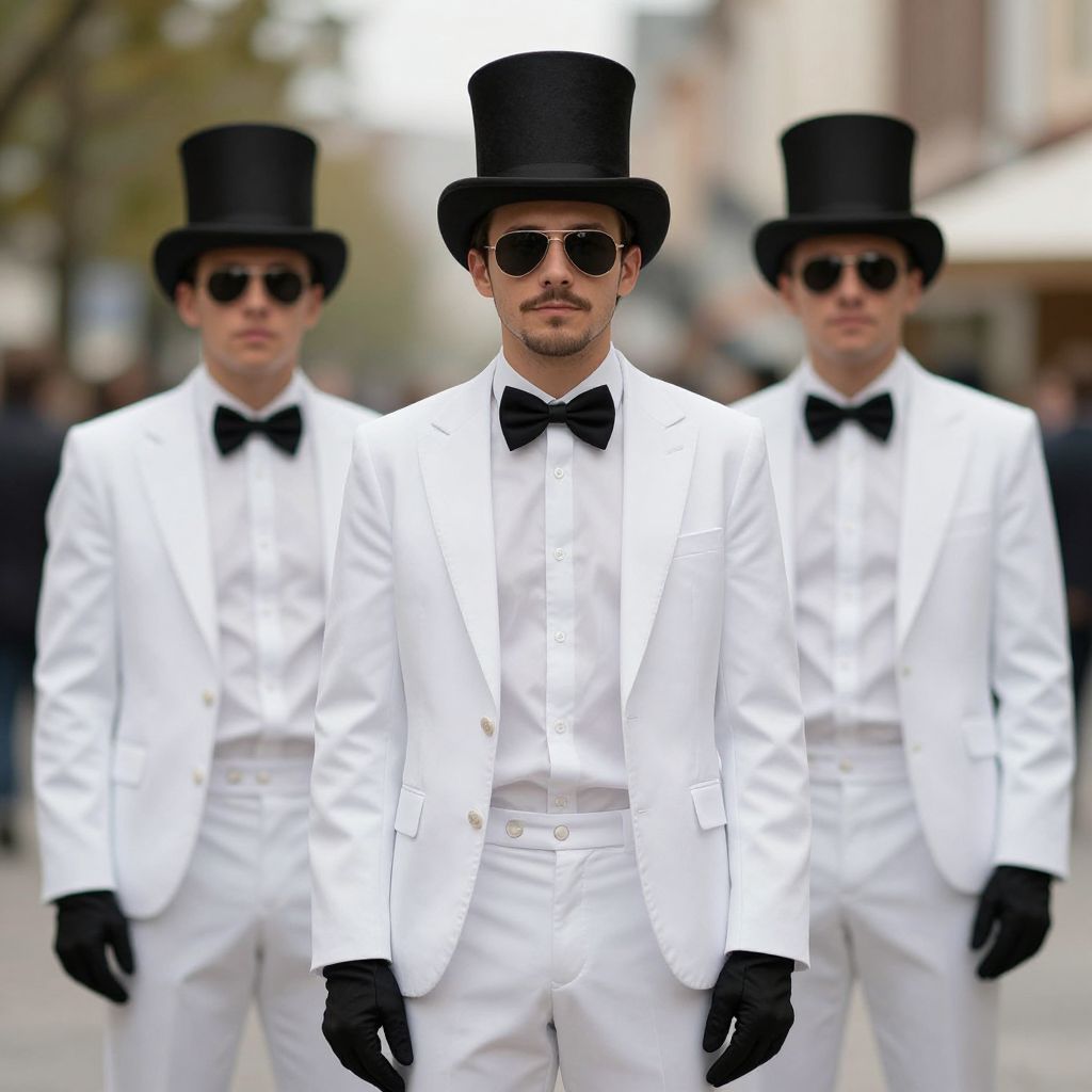 Photograph of three men standing in a street, wearing identical white tuxedos with black bow ties, black top hats, black gloves, and aviator sunglasses. The central man, with a trimmed beard and mustache, is in sharp focus, while the two men in the background are slightly blurred. The background shows an urban street with blurred buildings and trees. The men's outfits create a striking contrast against the urban setting, emphasizing a formal, almost theatrical style. The central man's serious expression adds a sense of purpose or solemnity to the scene.