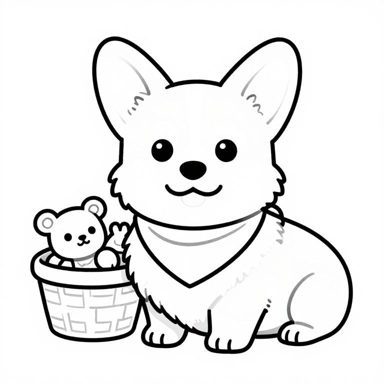 Corgi coloring sheet depicting a corgi wearing a small bandana sitting beside a basket of toys, charming line art with expressive eyes and fluffy fur details, perfect for a coloring activity with imaginative elements in a friendly cartoon style.