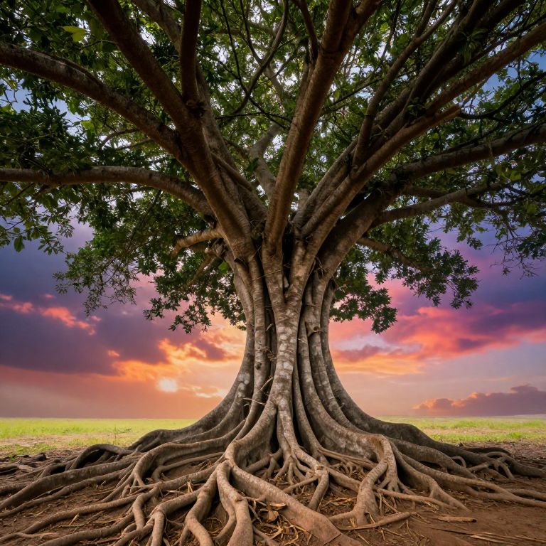 A colossal tree stands as a guardian of the horizon, its massive roots intertwining with the earth while its branches reach toward a sky painted with cosmic hues, defying the ordinary boundaries between land and heavens.