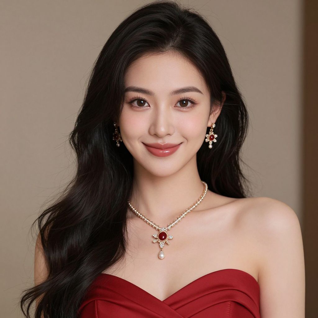 Photograph of an Asian woman with fair skin and long, wavy black hair, wearing a strapless, red dress. She has dark brown eyes, subtle makeup, and a light smile. She is adorned with a gold necklace featuring a red gem and matching gold earrings with small red gems. The background is a plain, beige wall, and the image is well-lit, highlighting her smooth skin and elegant jewelry. The overall style is sophisticated and polished.