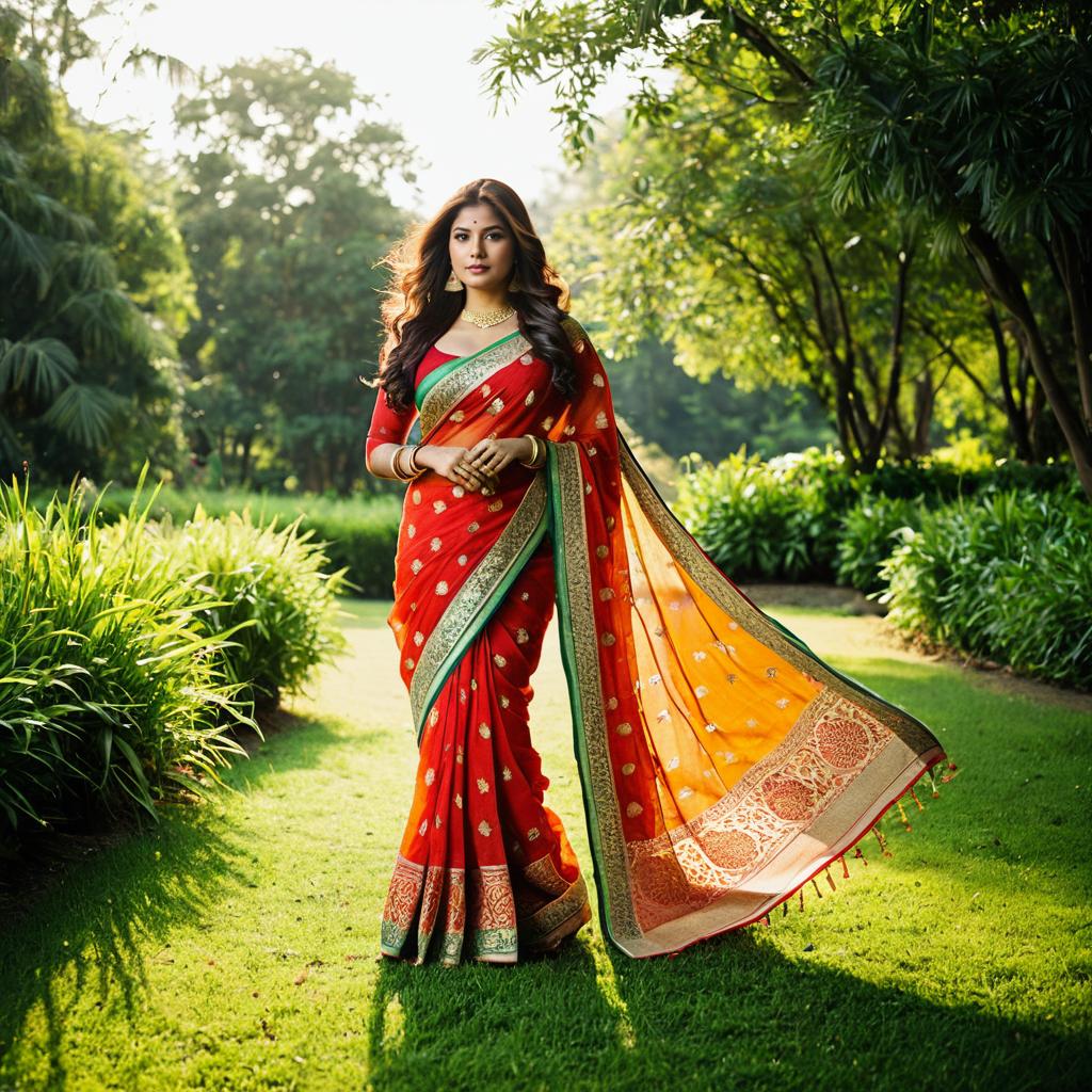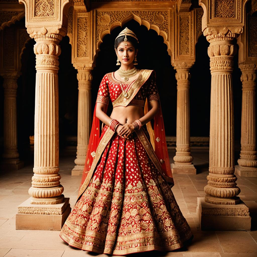 Full-body portrait of an Indian woman wearing a traditional red and gold lehenga with intricate embroidery and detailed patterns. She is adorned with elaborate gold jewelry including necklaces, bangles, earrings, and a matching ornate headpiece. Her dark hair is styled in an elegant updo. The background features ornate stone pillars and arches showcasing traditional Indian architecture. The warm, soft lighting enhances the regal and poised appearance of the subject, highlighting the cultural attire and craftsmanship.