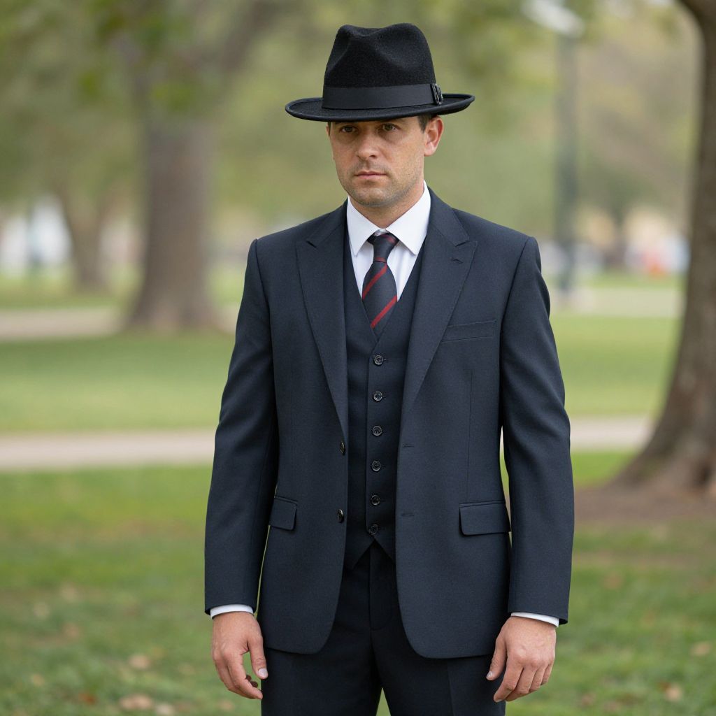 "Zoot Suits Costume, man in a suit and hat standing in a park"