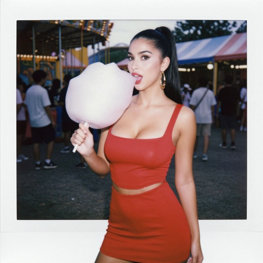 A petite woman, polaroid instant camera style, in a red bodycon mini dress with thin straps and asymmetrical waist panel, large gold hoop earrings, and a sleek high ponytail, enjoying an amusement park festival, holding a cotton candy. Sexy. Pretty face and beаutiful eyes. Big breasts