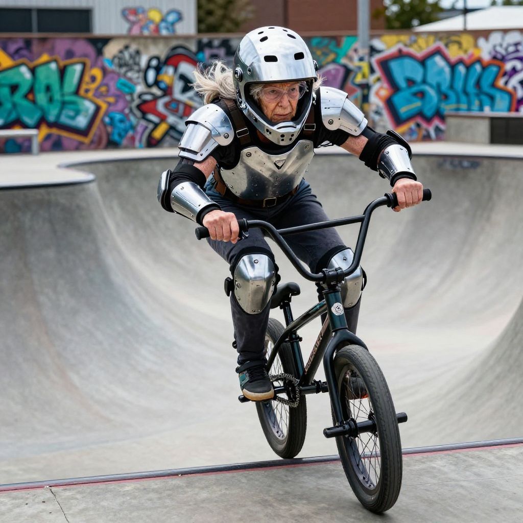 Extreme granny conquering a halfpipe on a BMX bike, wearing futuristic helmet and armor, urban skatepark environment with graffiti walls, intense expression, vivid colors and dramatic lighting capturing speed and adrenaline.