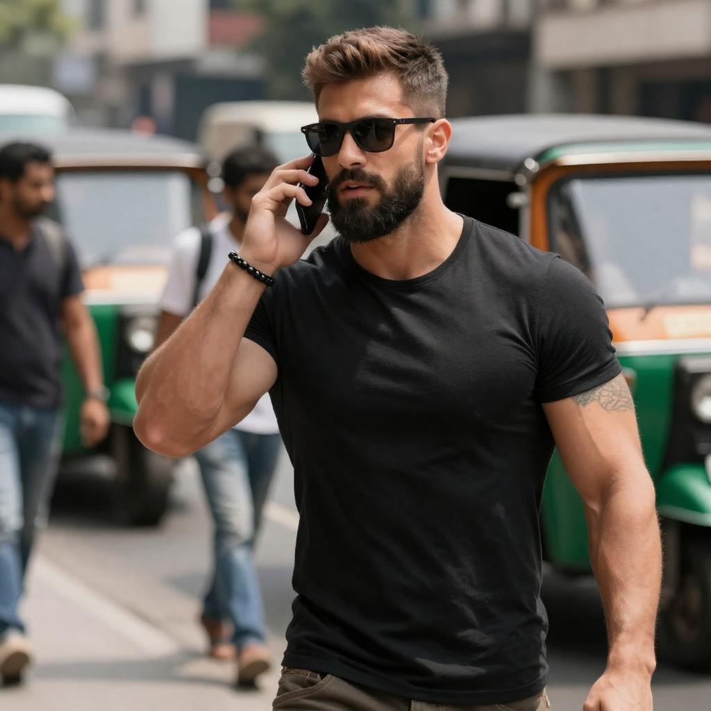Photograph of a muscular, bearded man with short brown hair, wearing sunglasses, a tight black t-shirt, and a black bracelet, talking on a cellphone. He stands in a busy urban street with blurred pedestrians and a green auto-rickshaw in the background. Sunlight casts shadows, highlighting his tattooed arm.
