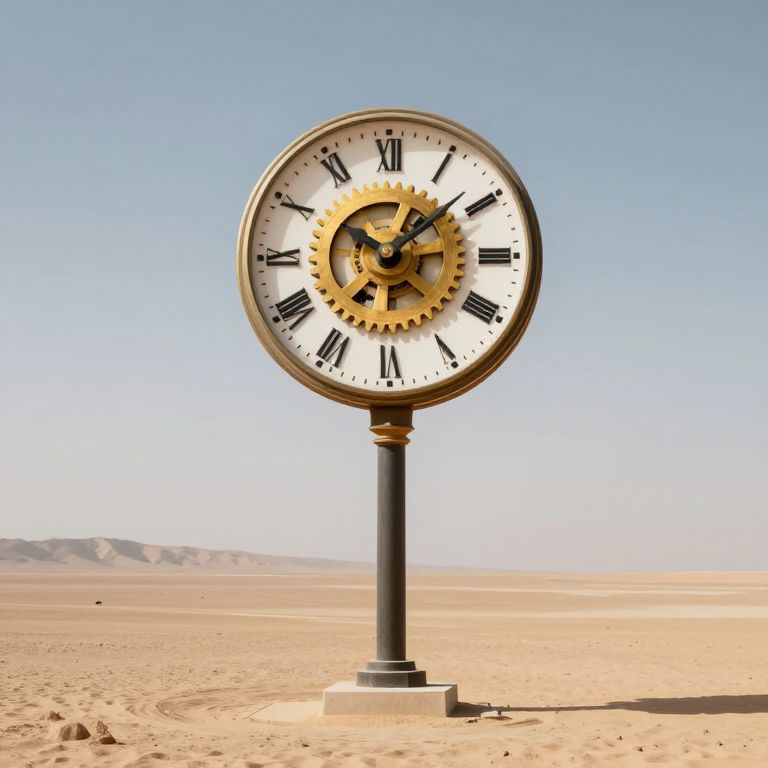 A towering clock stands alone in a desolate desert, its golden gears turning endlessly beneath a static face, defying the passage of time in a surreal, paradoxical dance.