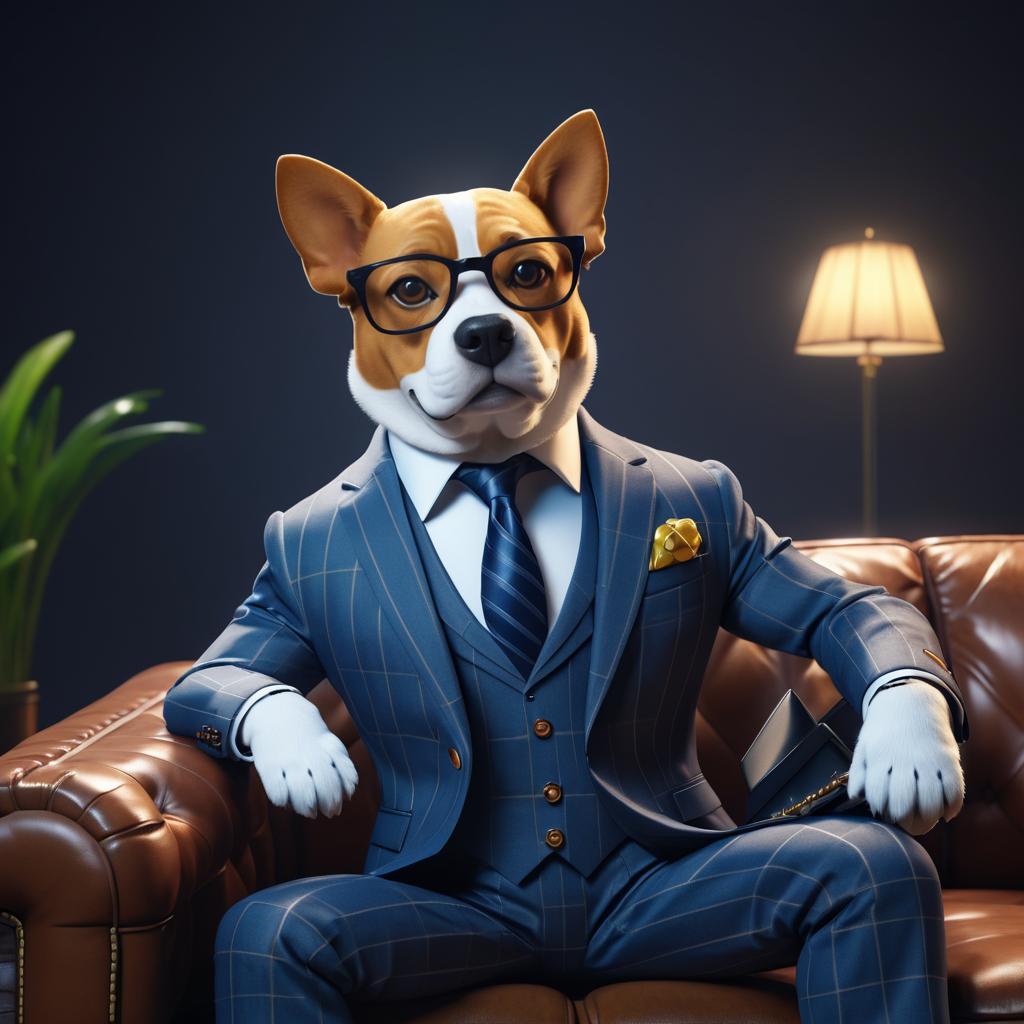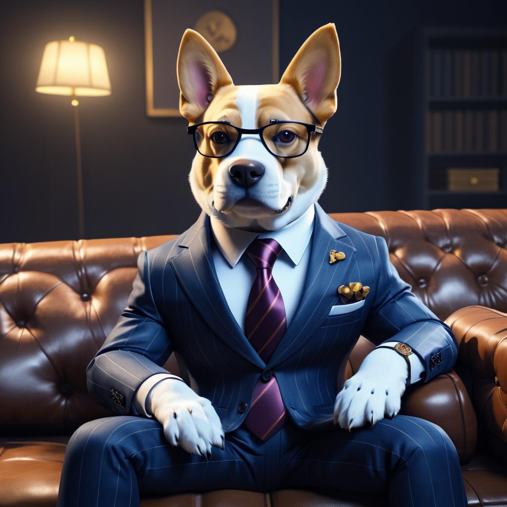 Anthropomorphic dog in a suit doing business on a detailed couch. Studio lighting, 8K resolution, trending on ArtStation, video game art style.