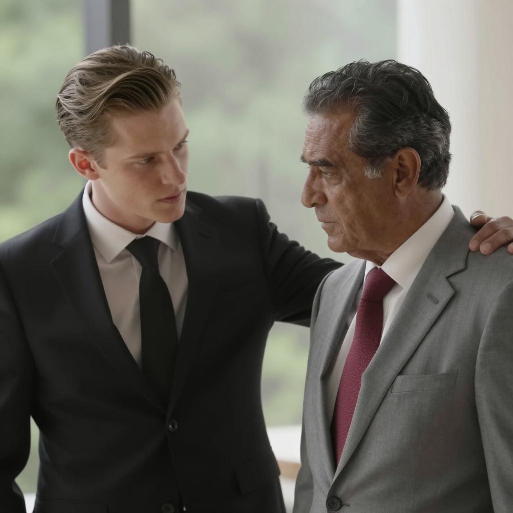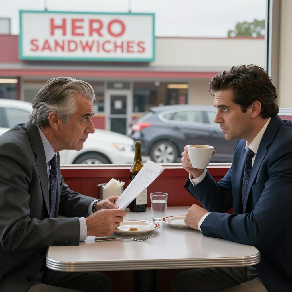 Photograph of two men in a diner. Both wear dark suits, white shirts, and ties. Man on left has greying hair, serious expression. Man on right has slicked-back hair, slight smirk. Foreground hand gestures towards them. Background: another man in white shirt, refrigerator, window. Various glasses and bottles on table.