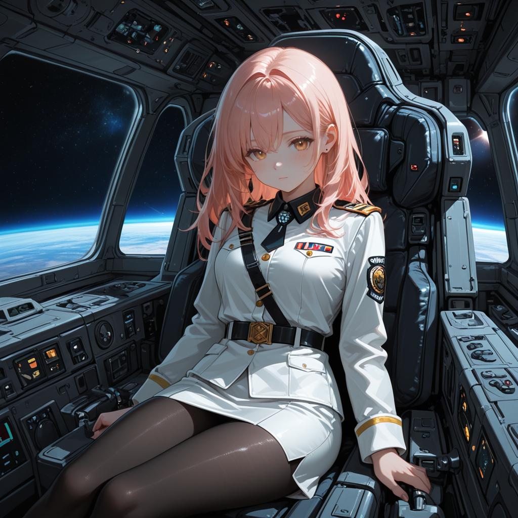Masterpiece, best quality, highres, ramius1, 1girl, solo, (black_pantyhose:1.1), military uniform, military, makeup, white shirt, white skirt, tight skirt, sitting, upper body, cockpit, space, open mouth