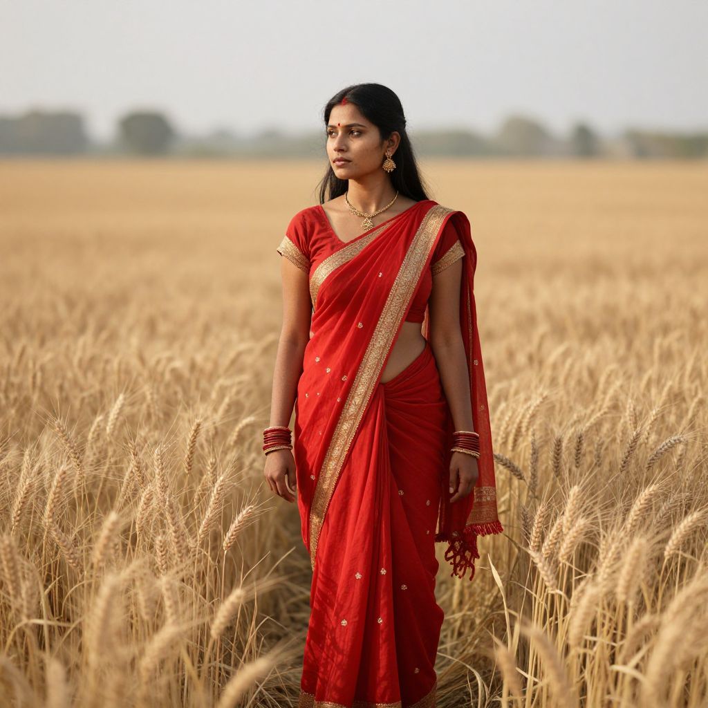 Photograph of an Indian woman in a red saree with gold trim, standing in a golden wheat field, looking forward. She has long dark hair