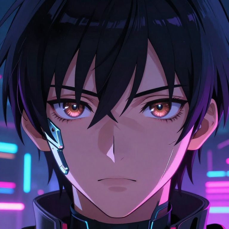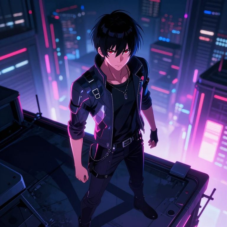 Anime red eyes glowing intensely on a mysterious character in a dark futuristic cityscape, detailed sharp features, vibrant neon colors, dynamic lighting