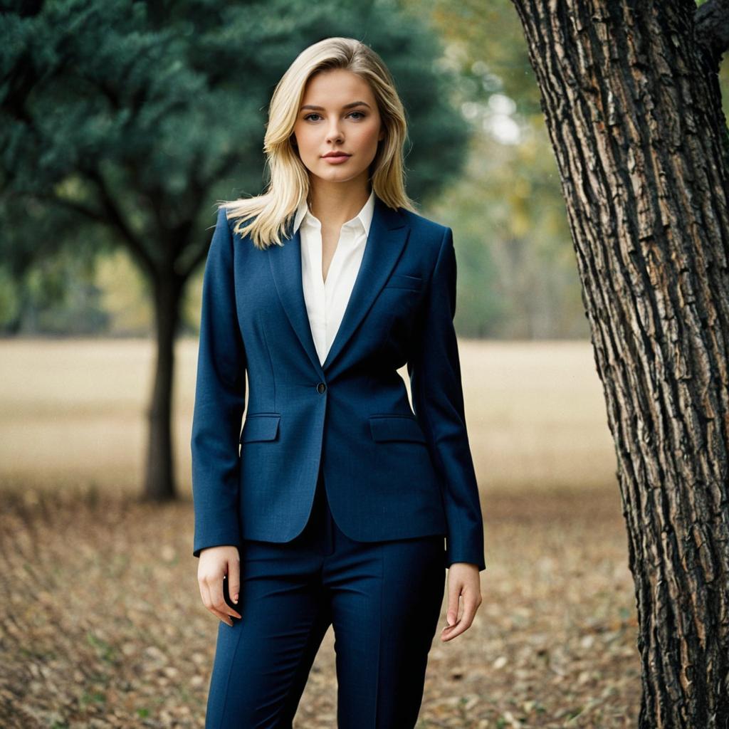 Modern pant suit,1girl, solo, realistic, blonde hair, tree, looking at viewer, outdoors, formal, lips, suit, photorealistic, jacket, shirt, blurry, blurry background