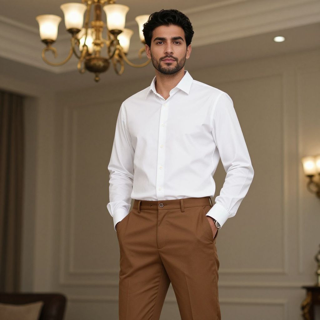Photograph of a handsome, dark-haired man with a trimmed beard, standing confidently in an elegant room. He wears a crisp white dress shirt with the sleeves slightly rolled up and brown trousers, with his hands casually in his pockets. The background features a luxurious setting with cream-colored walls, a gold chandelier with lit bulbs, and soft, ambient lighting. The man has a serious yet approachable expression, and the room's decor suggests a refined, classical style. His attire is formal yet relaxed, complementing the sophisticated atmosphere.