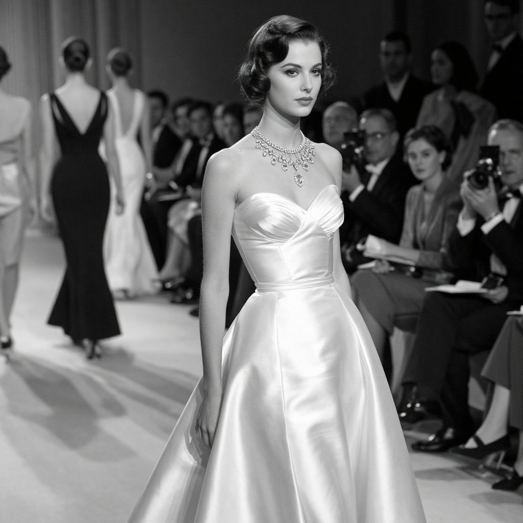 A black-and-white photograph capturing the elegance of Dior's 1959 fashion collection at the Moscow fashion week, featuring a woman in a luxurious satin gown adorned with a sparkling necklace, set against a backdrop of formal attendees in a vintage, high-definition style reminiscent of classic cinema.
