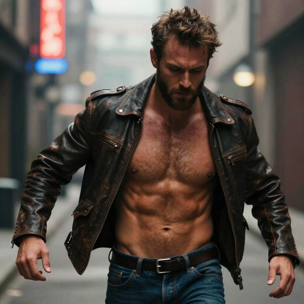 Photo of a rugged man wearing leather jacket and jeans, soft focus, photo by mark henderson, cinematic, natural lighting, muted colors, night, bokeh, face portrait, (extreme close up:1), urban, huge pectorals, beard, dynamic pose, muscular, fog, red and blue neon city lights, alley, realistic, masterpiece, intricate details, detailed background, depth of field