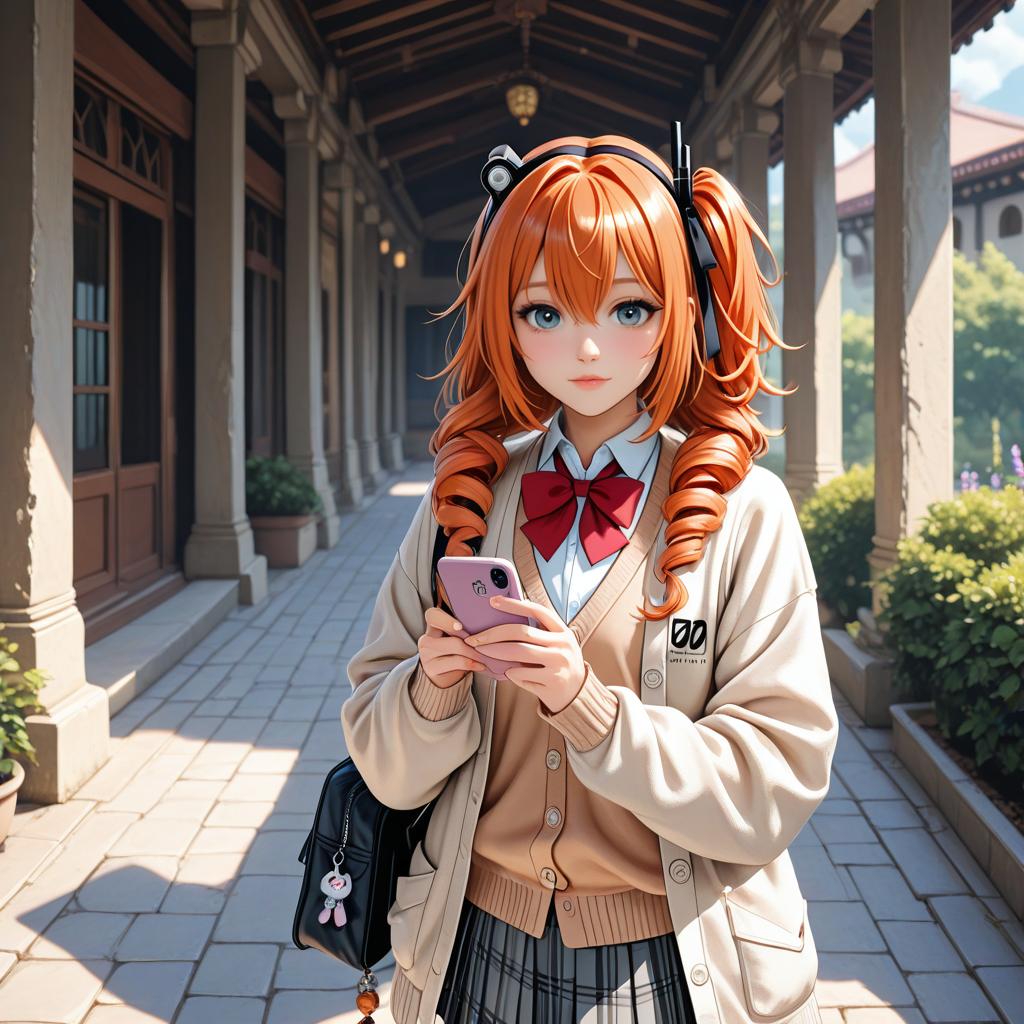Cowboy shot, adachi rei, school uniform, anime style, twin drills, very long hair, violet eyes, beige cardigan, red bowtie, pleated skirt, smartphone, smile, light lavender, ancient temple courtyard, deep in thought, charm-laden necklace
