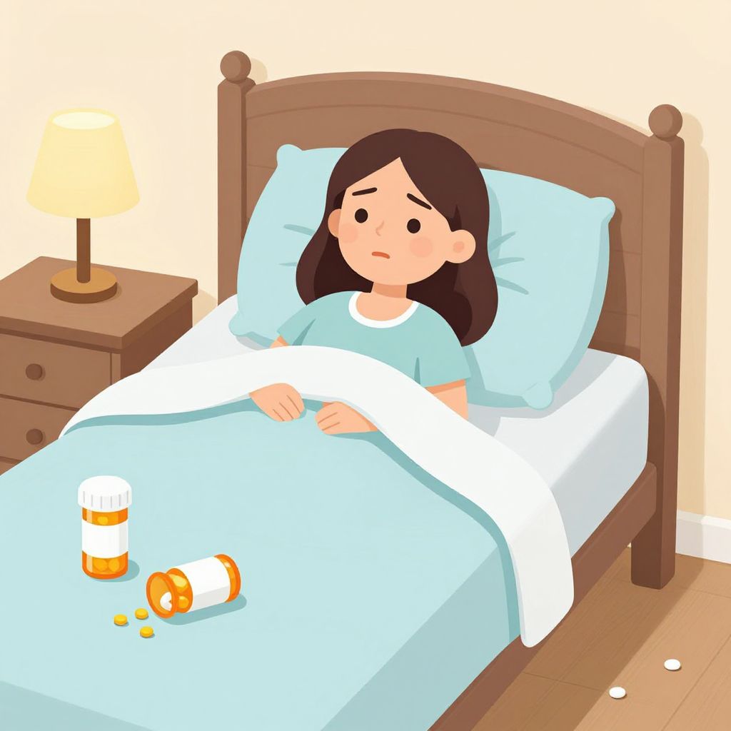 Digital illustration of a woman with fair skin and long brown hair lying in a wooden bed with a light blue pillow and white sheets. She wears a light blue shirt and looks concerned. A wooden nightstand with a lamp is on the left. On the bed, near her feet, are two overturned orange medicine bottles with spilled contents. The floor is wooden, and the background is a plain beige wall. The style is simplistic and cartoonish, with flat colors and minimal shading.