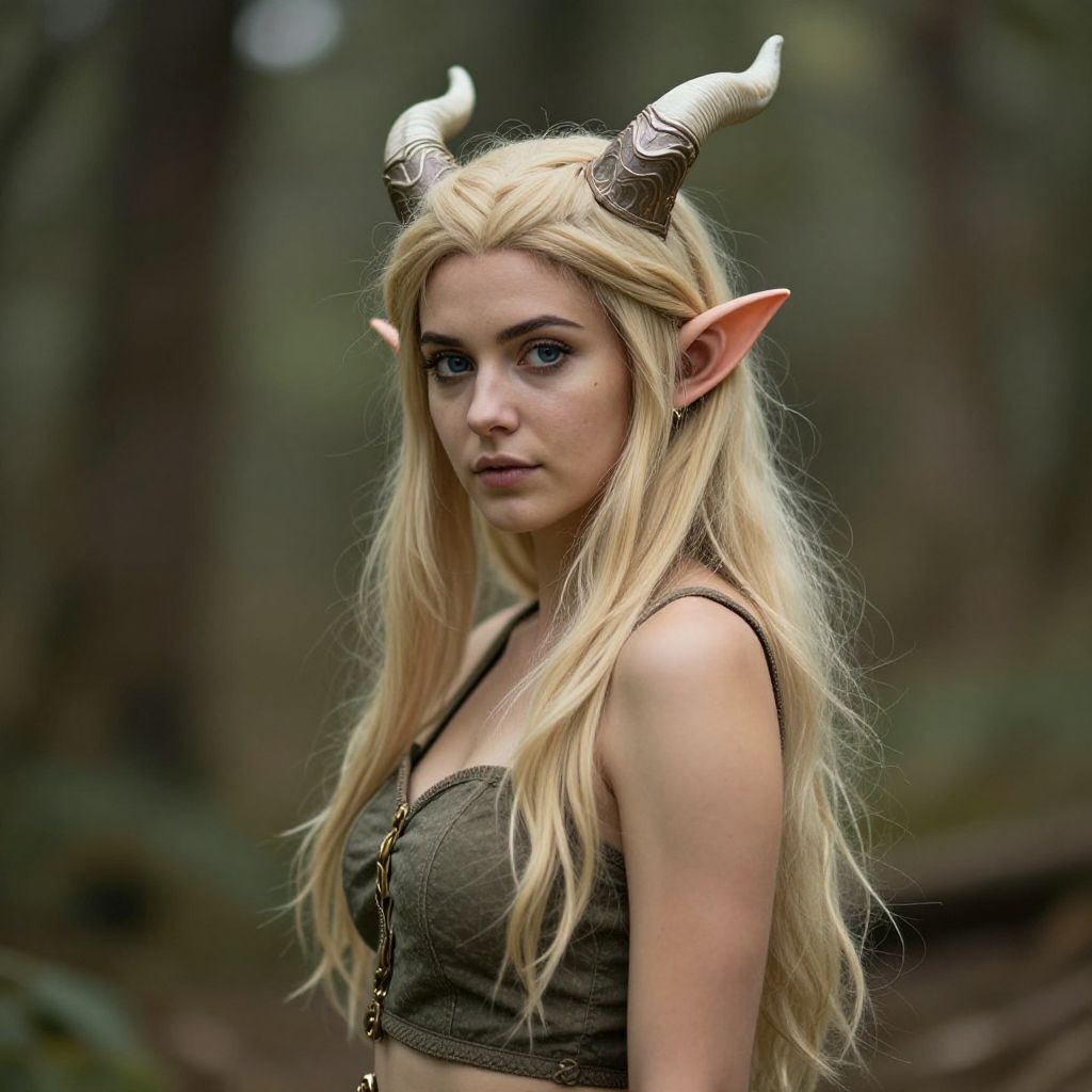 Photograph of a blonde woman with elf ears and white, curved horns, wearing a green crop top, standing in a forest.