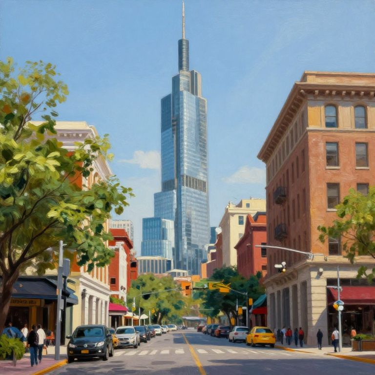 A vibrant oil painting-style depiction of a bustling city street scene, featuring a modern skyscraper as the focal point, surrounded by historic buildings and lush green trees, rendered with rich colors and dynamic lighting effects that evoke a sense of depth and realism.