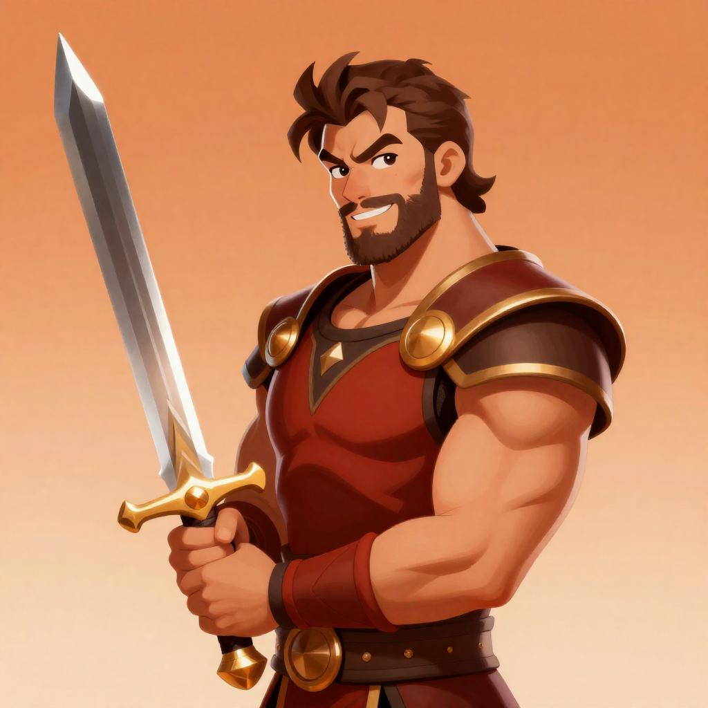 Digital illustration of a muscular, bearded man with brown hair, smiling intensely. He holds a shiny, silver sword with a gold hilt in his right hand. He wears a brown sleeveless top and red wristbands. Bright orange background. The man is on the right, taking up about half the image.