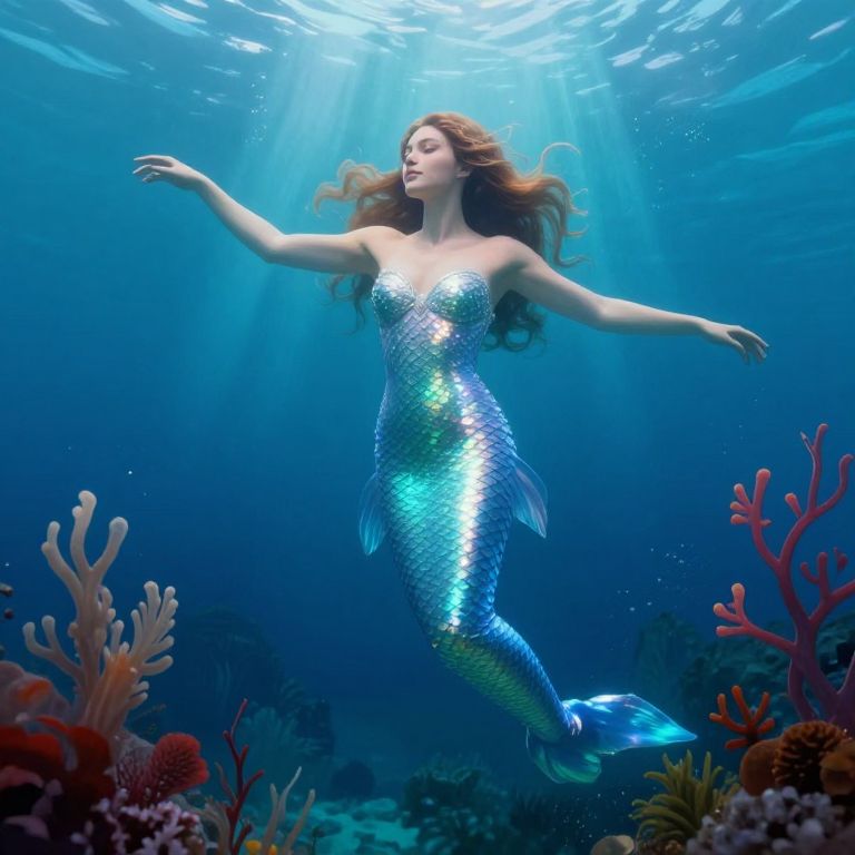 Photograph of a serene mermaid with long red hair, shimmering blue scales, floating underwater, surrounded by colorful coral and sea life. Sunlight