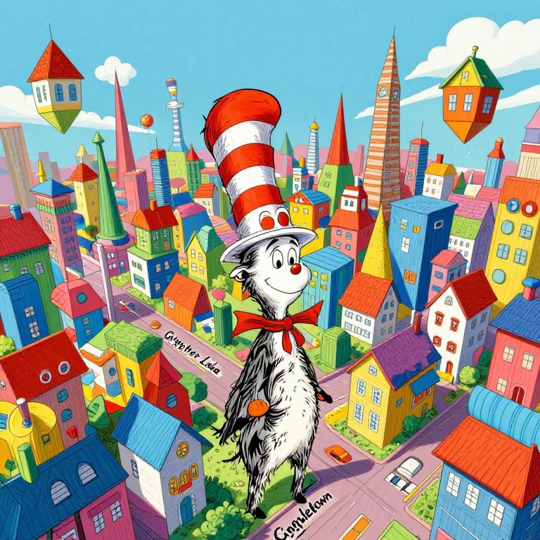 Envision a captivating digital artwork inspired by the imaginative illustrations of Dr. Seuss, infused with surreal elements. This whimsical cityscape is viewed from an elevated angle, showcasing towering structures composed of vibrant geometric shapes reaching for the heavens, creating a harmonious chaos in the skyline. Streets named after cheerful adjectives like \"Giggletown\" or \"Laughter Lane\" are lined with houses defying gravity and floating mid-air, evoking a sense of wonder and curiosity as one navigates through this fantastical metropolis where reality intertwines with the vivid dreamscapes of Dr. Seuss's imagination. The oblique camera perspective provides an aerial view that emphasizes the whimsical architecture and enchanting atmosphere of this imaginative cityscape.