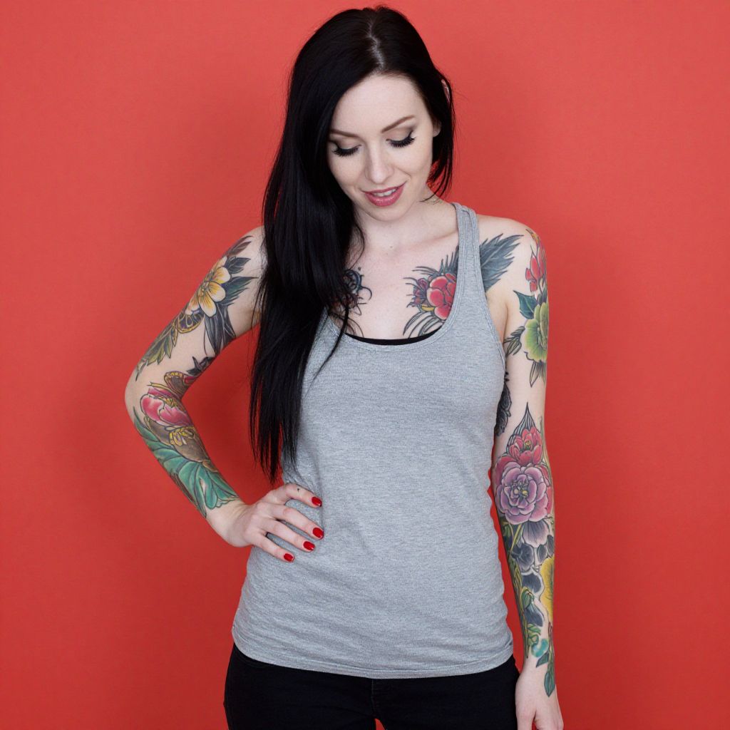 Photograph of a pale-skinned woman with long black hair, wearing a gray tank top and black pants, standing against a bright red background. She's looking down, smiling, with her right hand on her hip and her left arm relaxed by her side. Her arms and chest are covered in colorful, detailed tattoos featuring flowers and other intricate designs. Her red nails match the background.