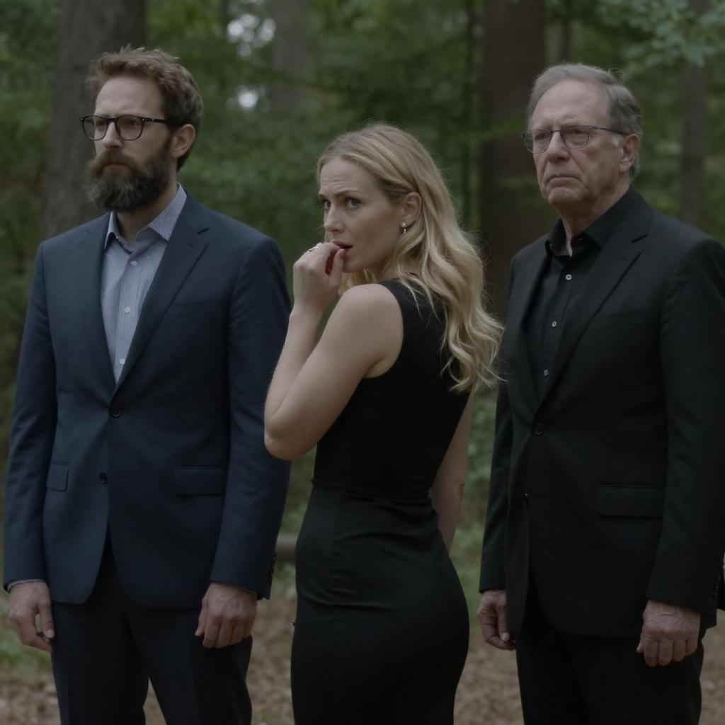 Photograph of three people in a forest. Blonde woman in black dress, back to camera, looking over shoulder, hand near mouth. Bearded man in glasses, dark suit, looking to the left. Older man in glasses, black suit, looking forward. All three in shadows, green forest background. Intense expressions.