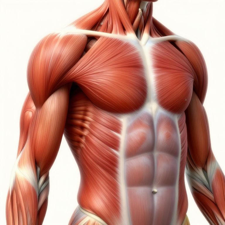 Digital CGI of a muscular male torso, highlighting detailed red and white muscle fibers, showcasing defined pectorals, abs, and arms.