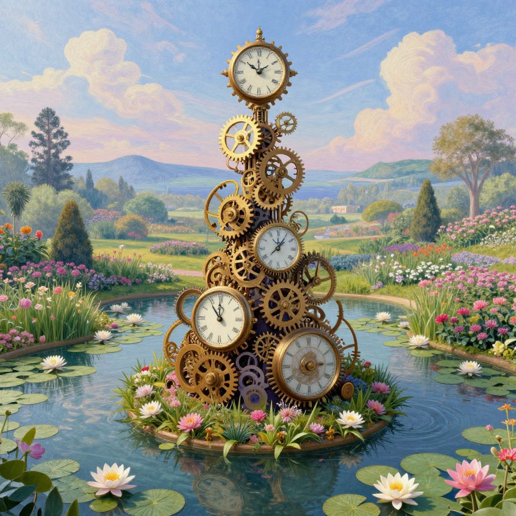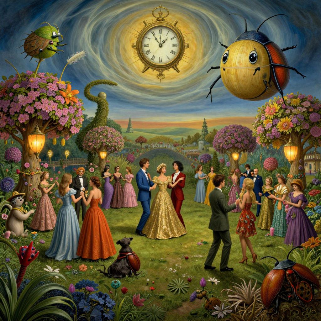 Whimsical fairytale garden scene with clock moon, giant bug, flower baskets, clock, dancing couples, colorful dresses, vibrant flowers, and